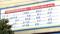 「五百旗頭」(東京都練馬区)投稿者・枡田さん 「五百旗頭」と書いて「いおきと」と読む名字。 源平合戦の時代に五百人の軍隊の旗頭だったことから 生まれた名字で、この漢字で「いおきべ」とも読めるそう。 「御簾納」(千葉県千葉市若葉区) 「御簾納」と書いて「みすの」さんという名字。 その昔、天皇家に簾を納める職業だったことが由来だという。 「珍名さんがいっぱいのお店」(千葉県千葉市若葉区)投稿者・増田信則さん(59歳) お店の看板に「珍名さんいらっしゃ〜い」という文字と 珍しい名字の数々が書かれている光景。 看板に書かれている名字は「正月一日(あう)」 「男心(なじみ)」「い(かなはじめ)」など。 このお店はハンコ屋さんの「モリシタ」。 42年間ハンコ屋さんを営んできたご主人が 特に珍しい名字を集めて看板を作ったそう。 |