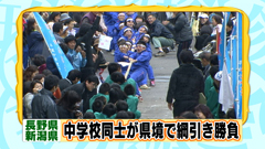 津南町立 上郷中学校と、隣町の長野県栄町・栄中学校が 一般道路上になる新潟県と長野県の県境で 学校対抗の綱引き勝負! 上郷中学校と栄中学校の距離は約800mで 昔から交流があり、8年前からは「しなちく祭り」として 県をまたいで綱引きをしているそう。 上郷中学校は生徒数の減少により 今年度で閉校となるため、今年が最後のしなちく祭りだった。 |