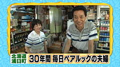 酒屋さんを営んでいる森商店のご夫婦は、 毎日ペアルックで過ごしている仲良しご夫婦。 ご夫婦は、結婚して以来30年間、よほどの用事でもない限り 毎日ペアルックを着てどこにでもお出かけしているという。 夫婦円満の秘訣は、手をつないで 「今日も仲良しありがとうね」と言いながら寝ることだという 森さんご夫婦は、奥さんの名前入りの日本酒を作って お店で販売するほどのラブラブぶりでした。 |