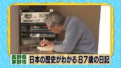 さやかさんのおじいさんである伊藤和夫さん(87歳)が 昭和14年、12歳の頃から74年間ほぼ毎日 書き続けた日記が、すべて当時のまま残っている光景。 商店を営む家庭で育った和夫さんが、12歳の頃に 売れ残りの日記帳をもらって書き始めたのがきっかけで、 1日の出来事を思ったまま書きためてきたという。 日記には当時のお小遣いの記録、 第二次世界大戦中の徴兵検査や出兵する友人への思い、 お見合い結婚前日の複雑な心境、東京オリンピックのこと など、日本の歴史がうかがえる日常が書き綴られていた。 和夫さんは、手が動く限り、目が見える限り 日記を書き続けていきたいとおっしゃっていました。 |