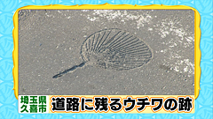 交差点の横断歩道にウチワの跡がくっきりとついている! 普段歩いていても気付かなかったという田さんだが、 落ち込んで下を向いて歩いている時に発見したという。 おそらく、道路の舗装中アスファルトが固まる前に誰かが ウチワを落とし、それに気付かずにウチワの上を 多くの車が通過して深く埋め込まれてしまったと思われる。 |