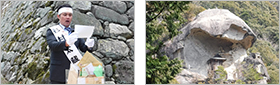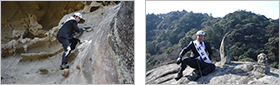 まずは傾斜角70度ぐらいと思しき鎖場「油こぼし」にはじまり、むき出しの巨大岩のくぼみにある岩屋本堂、そこを登ったら「抱きつき岩」〜「鞍掛岩」〜「小尻返し」〜「飛石」など奇岩、奇岩また奇岩・・・。自己責任とはいえ怖いものは怖い、屈強なスタッフたちが安全管理を徹底してはくれるものの今回もスパルタでした。