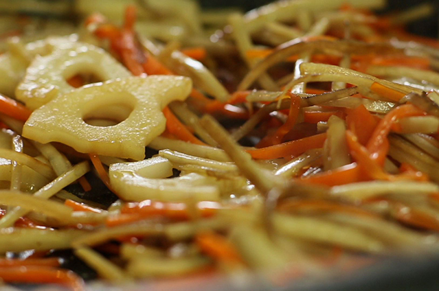 フランスでは使わないごぼうと子供たちが好きなレンコンを炒めて…