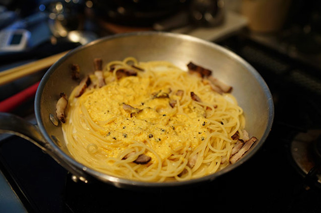 ベーコンが完成した日のメニューは、お気に入りのカルボナーラ。