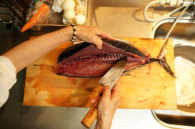 家では1匹のカツオをさばいて見せます。お魚がどうやって食べ物になるのか、
