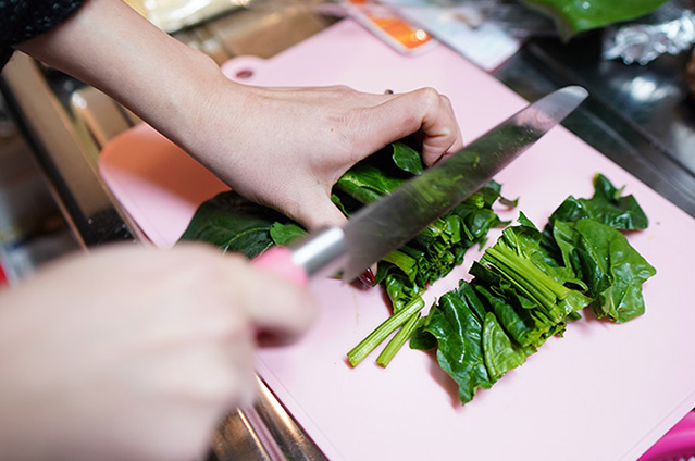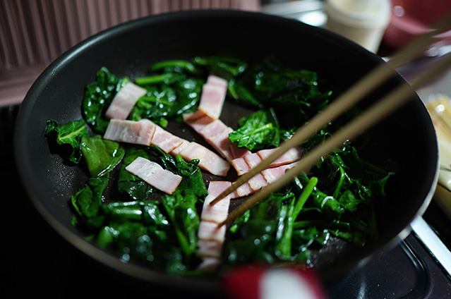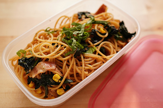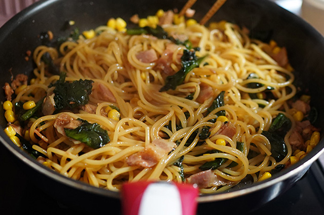 パスタの材料はツナ缶とほうれん草とベーコンとコーン。だし醤油とバターで絡めて味付けします。