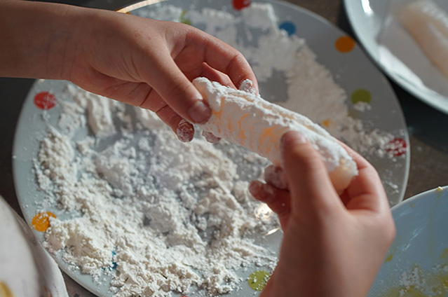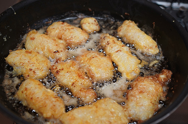 ムニエルと天ぷらの中間のような食べ方で、片栗粉と卵を衣にしてごま油で揚げます。