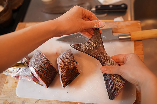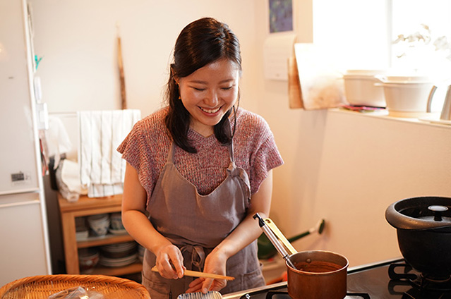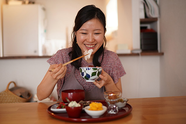 ある時、同世代の友人らが普段からきちんと朝食を食べていない、という事を知り、食生活に対する自分とのギャップを感じました。ビルが立ち並ぶ都会の裏通りにある、昔ながらの魚屋さんで買い物をして、その魚をベランダで干し物にする事も。旬の食材を生かした大好きな和食で、今日もお膳を美しく彩っていただきます。