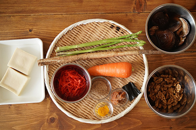 色合いのバランスと相性を考えた具材は、人参・小松菜・しいたけの煮物・くるみの甘露煮・高野豆腐・紅生姜・アボカド・サーモン・マグロなど20種類以上。その中からその日の組み合わせを選びます。