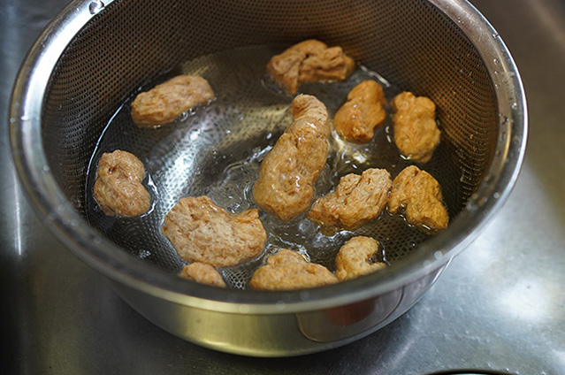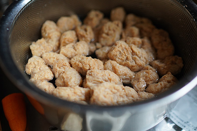 「大豆唐揚げ」は、肉アレルギーの後輩でも皆と一緒の食卓を囲める、という目的で炊き出しのメニューに導入しました。今では、普通にお肉を食べる後輩達にも好評です。