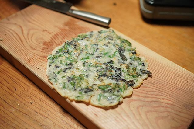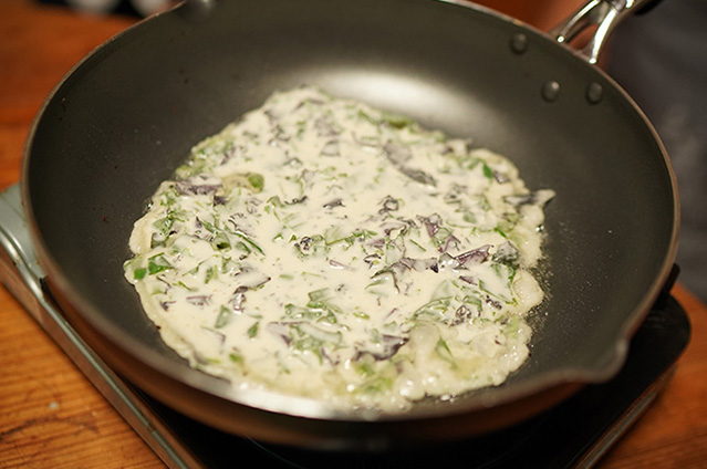 小麦粉の入った生地を薄く伸ばして両面を焼いて、黒砂糖を乗せて挟みます。