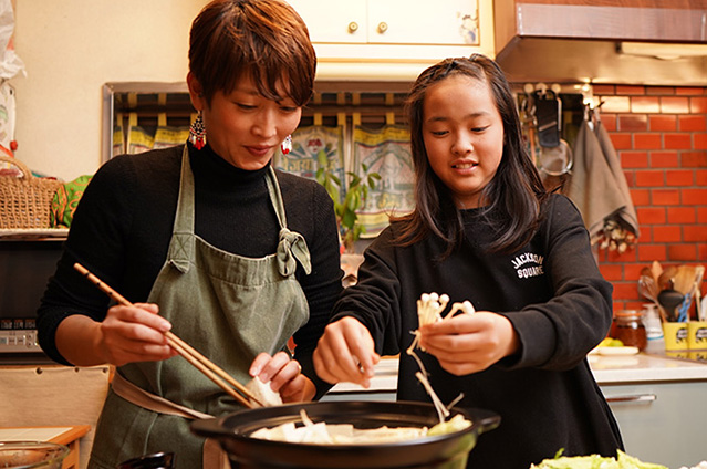最近、試しに作った"鶏の肉団子塩麹鍋"が大好評で、にんにく、生姜がたっぷりと入っていて、食べるとカラダがポカポカします。鶏の肉団子は、ネギ好きの子供たちのために、ネギのみじん切りをたくさん入れています。大好きな鍋を作るときには、子供たちも1人、2人とだんだんと集まって料理するのを手伝ってくれるそうです。