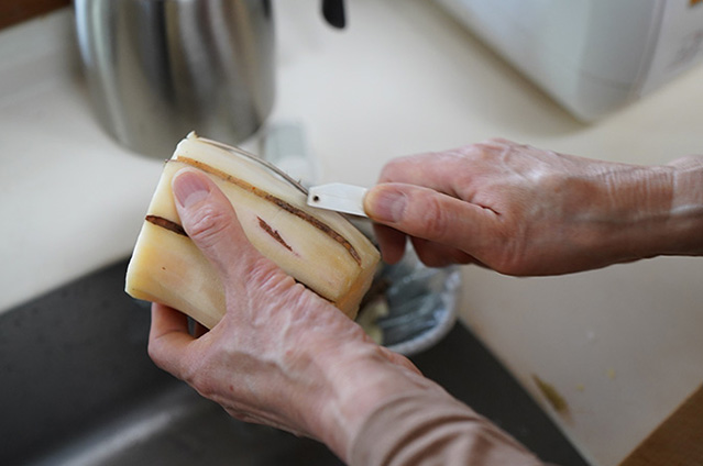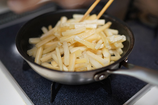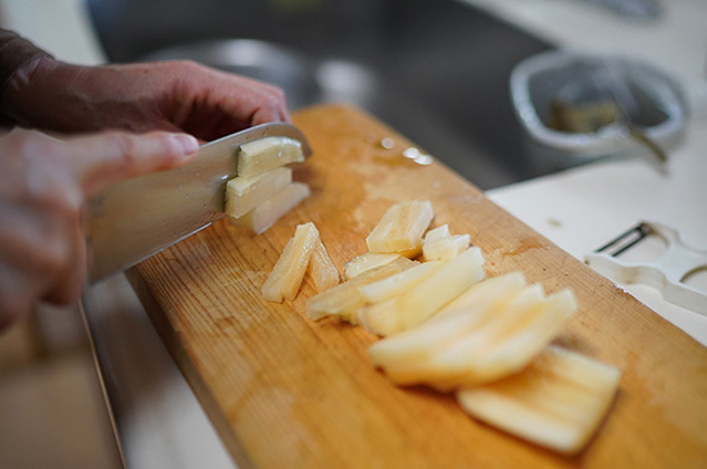 最初はジュースにしてみましたが泥臭く、味噌漬けにしたらしょっぱい…試行錯誤している時、食堂でたまたま食べたきんぴらゴボウからひらめき、「ヤーコンのきんぴら」を試してみました。するとこれが大正解!