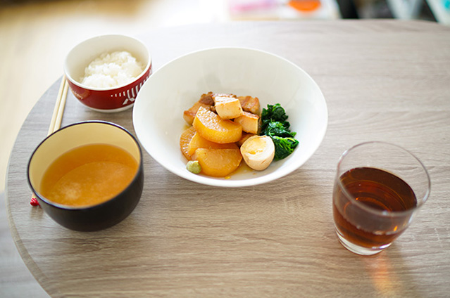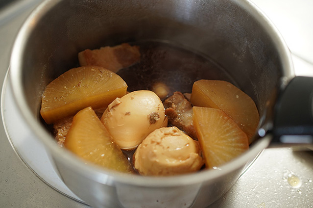 植田家では、おせち料理にも角煮が入っていました。豚バラ肉と大根を一緒に煮込んで作るのが令さん流。野菜を入れたりと、健康のためにも自炊を心がけています。
