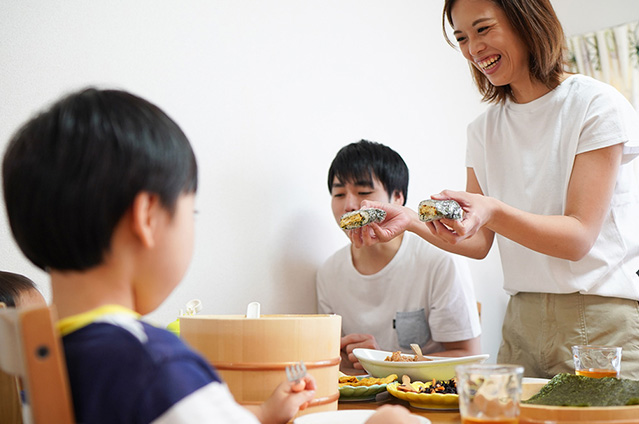4歳、2歳、1歳のお子さん達は、自分でやりたがりの盛り。手巻き寿司のように、それぞれ自分で握ったりします。「"おにぎり"という定番メニューで洒落っ気もないけど、私が子供たちを笑顔にできる得意料理」と子供たちが楽しんでくれる嬉しい食卓の時間でもあるそうです。