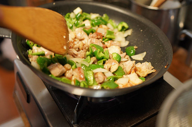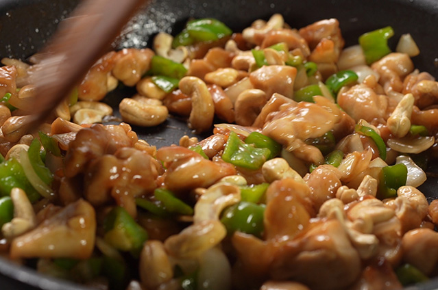 伊東さんの作る鶏肉とカシューナッツの炒めは「白ご飯が欲しくなる!」と奥様にも褒めてもらえる一品。お菓子店なので、常備しているカシューナッツを使って作るそうです。