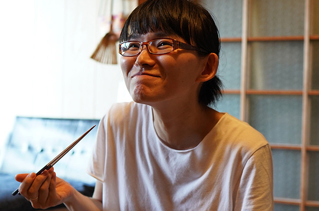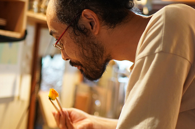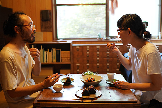 シンプルな色使いの画風が人気ですが、料理もやはりシンプルな和風の料理が好み。「カボチャの味噌炒め煮」もその一つで、フライパン一個で作るシンプルな料理です。フライパンで刻んだカボチャを軽く炒めて水を入れ、その上に味噌をのせて火を通します。最後に混ぜてバジルを入れると出来上がり。奥様と二人の食卓、お裾分け秋のカボチャに感謝の気持ちを込めていただいているそうです。