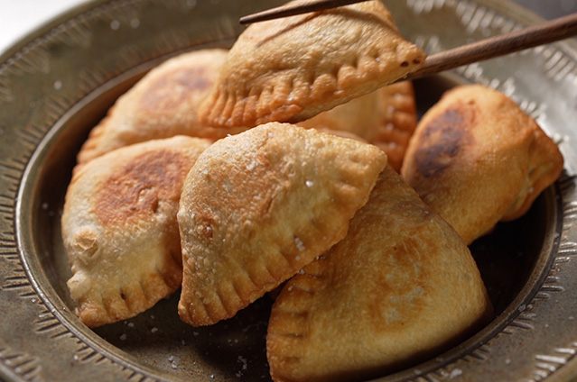 「サモサ」は、じゃがいも・タマネギ・エンドウ豆・レンズ豆に羊のひき肉を入れたインド料理の軽食のひとつで、小麦粉で作った薄い皮で包む揚げ餃子のようなもの。羊のひき肉の代わりに、収穫したての里芋を!桃子さんのこだわりは、スリランカ風のスパイス。ターメリック、クミン、アジョワン、カレーリーフ、シナモン、レッドペッパー。数年前にスリランカを旅したときに現地の方に料理を教わって、自分なりにアレンジしてメニューを増やしてきた自慢の一品だそうです。
