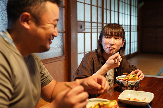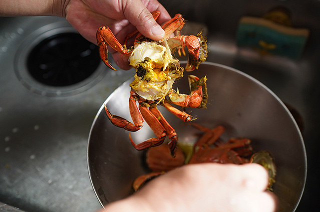 地元では「ガネ(蟹)ご飯」と呼ばれていて、甲羅を外して、包丁で2つに割り洗ったお米に載せたら、味付けは薄口醤油を少々で十分。ガネ(蟹)からいいダシが出て、とても美味しい炊き込みご飯が出来上がります。