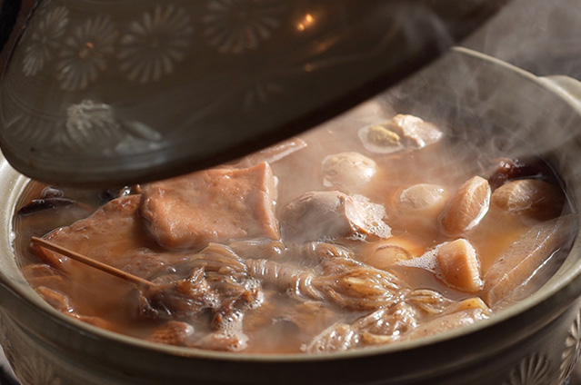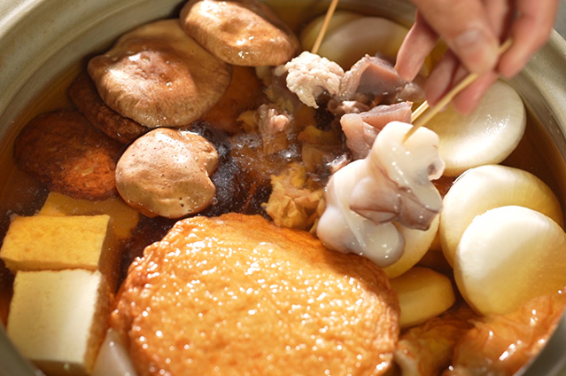 奥さまが、囲炉裏に魅せられて決めた家。特に秋が深まるこれからの季節は、鍋をかける機会が増えます。色々な種類の鍋を作りますが、奥さまが大好きなのは、弘人さんの作る「おでん」。土鍋に、昆布と骨なし鳥モモ肉で出汁を取り、こんにゃく、大根、はんぺん、厚揚げ、お麩、巾着、牛すじなどを入れて囲炉裏でグツグツと煮込みます。美味しそうにおでんを食べてくれる奥さまの笑顔を見る度に、囲炉裏のある家に出会えて良かったと思うそうです。