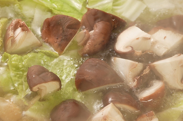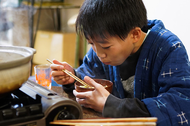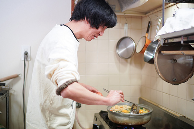 母の味に習い夫が作ってくれ、いろいろな種類のうどんがありますが、冬は土鍋でどーんと作る煮込みうどんが定番!昆布出汁に鶏肉、大根、人参、白菜、油揚げ、しいたけなどで、味付けは酒、みりん、醤油、塩が基本で、関東の雑煮みたいな味付けの汁です。決めては胡麻油。うどんを入れたら鰹節をどさっと入れ、卵を割って入れます。それを各自で器によそって、卵を崩しながら食べるのが家族みんなの楽しみ方です。