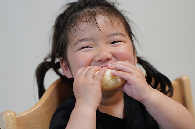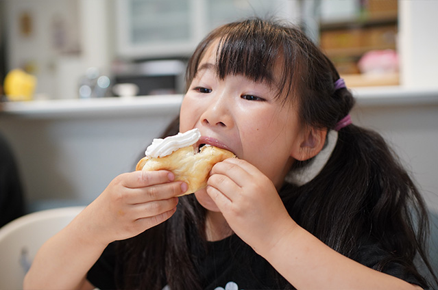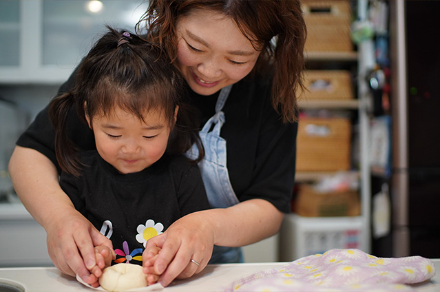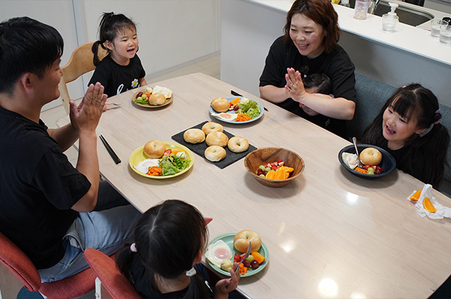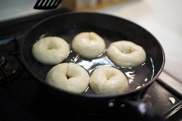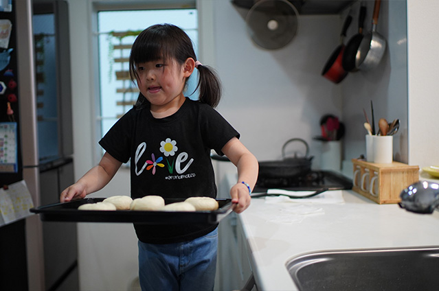 パン作りが趣味の愛子さん。ご家族に体に優しい焼きたてのものを食べさせてあげたいと思ったことがキッカケで、パンを焼き始めました。その中でも四人のお子さんの大好物がベーグル。お腹を空かせると「かたいパンつくって〜」とリクエストが。成形の時には、生地を触ったり、お手伝いしてくれることも。焼きたてはそのままガブリ、次の日はサンドイッチ風にすることもあり、シンプルなベーグルは塩野家には欠かせない一品。美味しそうに食べてくれるお子さんたちの笑顔は、何よりも愛子さんの日々の原動力になっています。