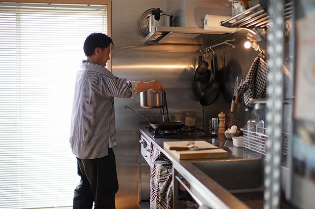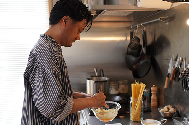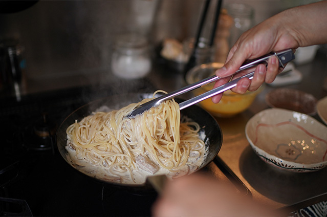 カルボナーラは、祐輔さんが一人暮らしの時によく作っていた料理です。当時は味を濃くして、ボリュームを重視して作っていましたが、現在は幼い娘さんが食べられるように、味を濃くし過ぎず、いつも入れている唐辛子も入れずに作っています。好き嫌いの多い娘さんもいつも美味しそうに食べてくれる大好きな一品。祐輔さんが作ってくれるカルボナーラは、普段は料理担当をすることが多い妻の奈々さんにとっても最高に嬉しいご褒美料理でもあります。