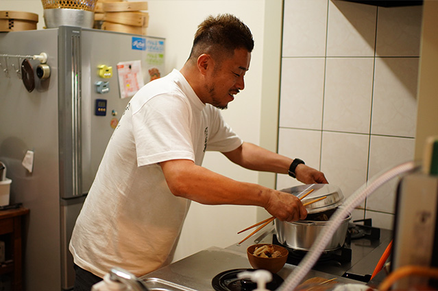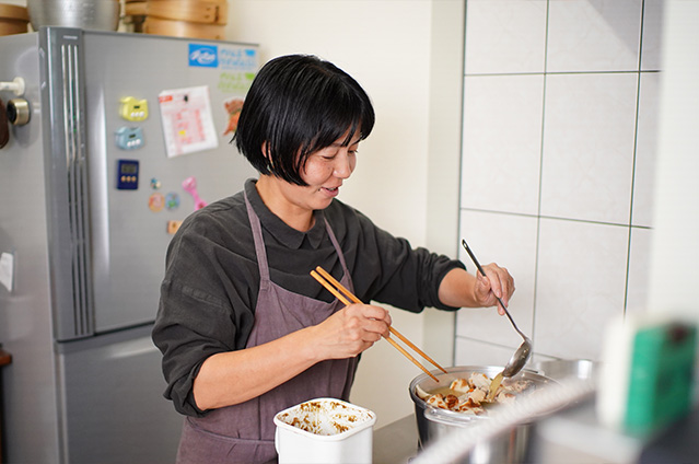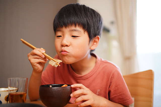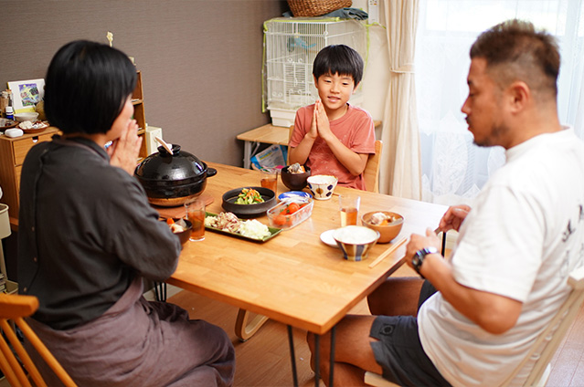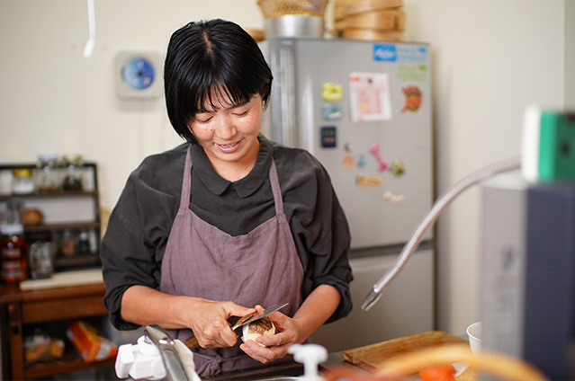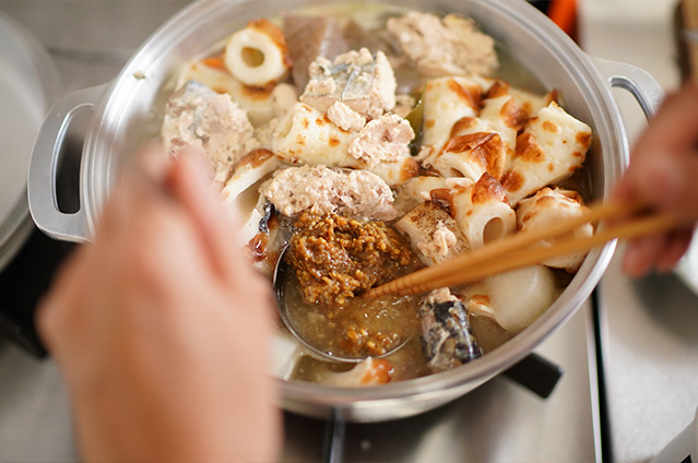大根汁は、寛子さんがお祖母さまの家に遊びに行くと、よく作ってもらっていたお味噌汁です。大きくざく切りにした大根、ニンジン、里芋、こんにゃく、レンコンなどと一緒にサバの水煮缶、そしてポイントになる具材の焼きちくわを加えてコトコトと煮込みます。お味噌汁というより、おでんのような感覚に近いかもしれません。幼い頃は大きなサイズの野菜が食べにくく、あまり得意ではありませんでしたが、大人になってからは、時々無性に食べたくなるそうです。体にも心にも優しい一品でもあるので、 これからもご家族のためにずっと作り続けていきたいと寛子さんは思っています。