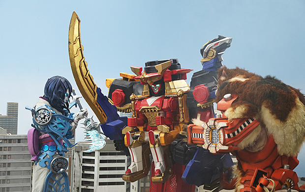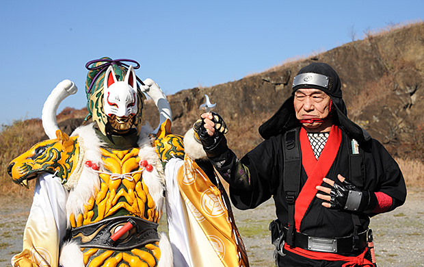 親子三代アカニンジャーそろい踏み! ニンジャ全員集合で挑む、牙鬼幻月との最終決戦! まずは、ニンニンジャー6人による連携攻撃で幻月に強烈な一撃を。さらに、天晴・旋風・好天 三代そろっての忍烈斬が炸裂。そして最後は全員で必殺技を! しかし、幻月は封印されていた間に力を蓄えており一筋縄ではいかない。