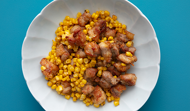 鶏もも肉・・・1枚(280g) <衣と下地> |醤油・・・小さじ2 |酒・・・大さじ1 |小麦粉・・・大さじ2 |片栗粉・・・適量 揚げ油・・・1/3カップ とうもろこし・・・1本(300g) 塩・・・小さじ1/4 こしょう・・・適量