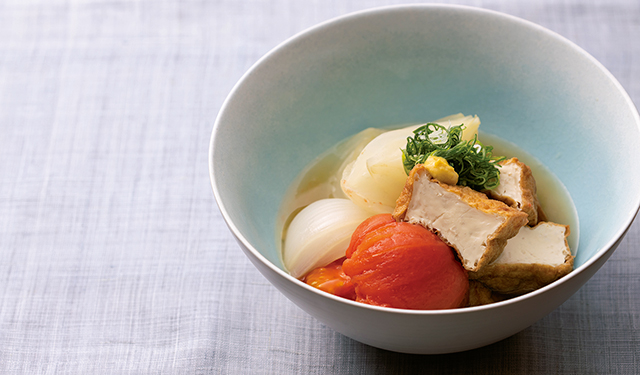 新玉ねぎ、絹厚揚げ、トマトのさっと煮