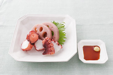 4. 3のたこの煮汁をきって一口大に切る。れんこんとともに器に盛り、からし醤油を添える。