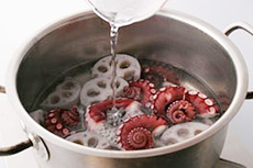 1. たこはぶつ切りにし、れんこんは皮をむいて8mm厚さの半月に切る。