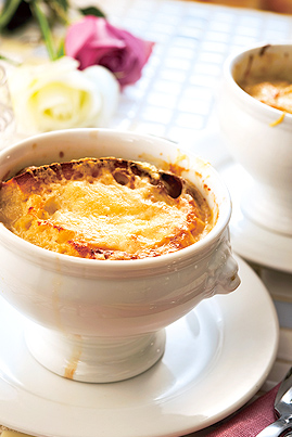 スープポットに入れ、こんがり焼いたフランスパンとグリュイエールチーズをのせて