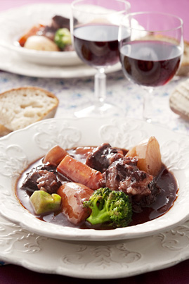赤ワインで煮込むので、たった1時間半の煮込みで本格的ビーフシチューが作れます。使う赤ワインは、辛口のものがおすすめ!大人のビーフシチューを是非お試しください♪