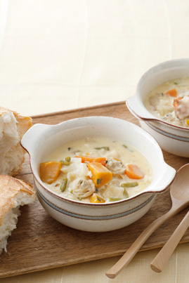 土井先生のクラムチャウダーはおいしいホワイトソースで作る、具だくさんのクリームシチューです!ホワイトソースのポイントは、小麦粉、牛乳を加えるタイミングと火をしっかり通すこと。缶詰のあさりでも、とってもおいしくできあがります♪