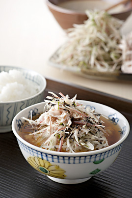 ご飯・・・適量 二番だし・・・3と1/2カップ 赤味噌・・・70g 鶏ささみ・・・2本 塩・・・小さじ1/2 酒・・・大さじ3 水・・・1と1/2カップ 薬味 生姜・・・40g 茗荷・・・3個 大葉・・・10枚 炒り黒ごま・・・大さじ2〜3