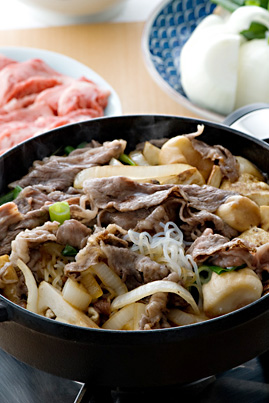 牛肉(すき焼き用)・・・500g 焼き豆腐・・・2丁 しらたき・・・350g 麩・・・12個 玉ねぎ・・・2個 松茸かきのこ・・・3〜4本 青ねぎ(太いもの)・・・3本 牛脂・・・適量 茹でうどん・・・適宜 <調味料> 砂糖、醤油、酒・・・各適量 卵・・・適量