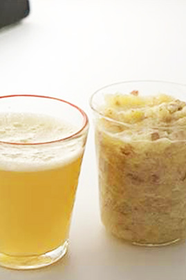 りんごはよく洗い、皮ごとすりおろし、ガーゼに包み、やさしく絞ってジュースにする。