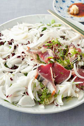 ◎材料(4人分) かつお(上身2本)・・・約600g サラダ油・・・大さじ1 <三杯酢> |酢・・・1/2カップ |砂糖・・・大さじ1と1/2 |塩、薄口醤油・・・各小さじ1/2 塩・・・適量 <薬味> |にんにく・・・2〜3片 |生姜・・・50g |青じそ・・・20枚 |玉ねぎ・・・1〜2個 |青ねぎ・・・4本 |紅たで・・・適量