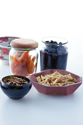 大人気☆土井家秘伝のおせち料理!!しわがなく美しい<<黒豆>>の作り方、一日目は「煮汁の中で黒豆を戻す」・二日目は「煮立たせながらしっかりとアクを取る」こと。たれの煮詰め加減がポイントの<<田作り>>は一日目に「少し焦げ色がつくくらいにじっくりと炒る」・二日目は「たれと煮絡める」とおいしく仕上がります。どちらも二日間で作れる嬉しいおせちです。