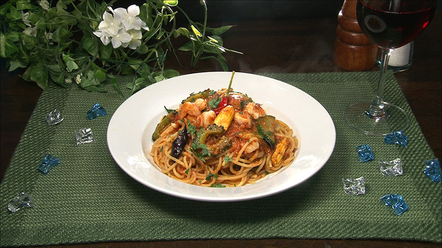 Cカラブリア産唐辛子のスパゲティ 海老・タコ・夏野菜たっぷりのトマトソース