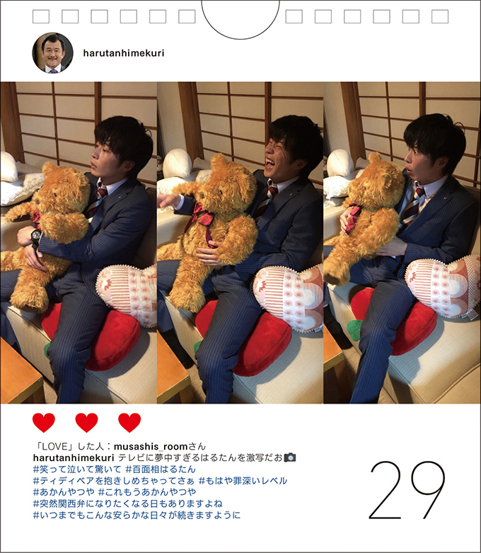 公式インスタグラム『武蔵の部屋』のように、日めくりオリジナルの、はるたんを想う武蔵の言葉やハッシュタグが満載!