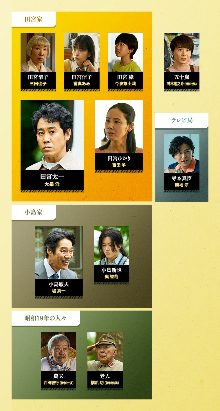 田宮太一 田宮ひかり 小島新也 田宮信子 田宮 稔 五十嵐 農夫 老人 寺本真臣 田宮清子 小島敏夫