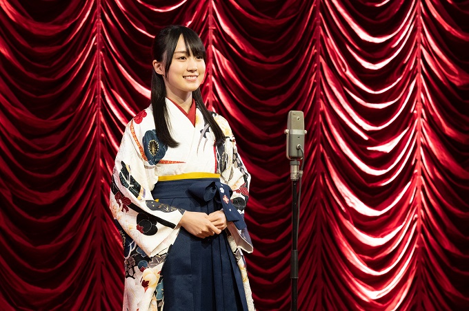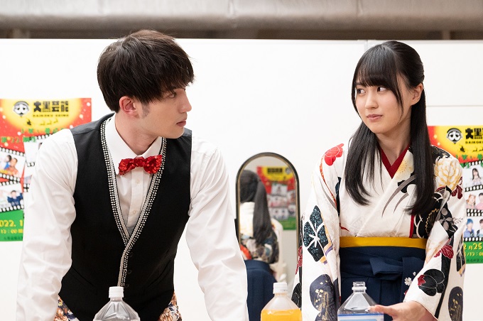 いざ舞台の幕が開くと、トップバッターの雨宮すみれ(賀喜遥香)の漫談で会場が爆笑に包まれる。息を飲んでモニターを凝視する生徒たち…。