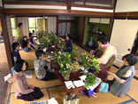 華道緑葉式の家元である芳子さんの華道教室は月2回。生け花やフラワーアレンジメントを行なっています。庭にある旬な花材を使い、義孝さんの花瓶に生けます。授業の終わったあと、義孝さんが飛び入りでお茶を立ててくれることもあります。