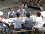 土曜日は週に一度のパン屋さんの営業日。全部で11種類のパンが並びます。素材にこだわるシンプルなパンが好評ですが、自家製のバジルやオレンジピールを加えたパンも人気です。開店早々、ご近所さんが集まってきました。手には畑で採れた野菜やハーブなどのお裾分けが・・・そして、パンを買った後は、お店の前で井戸端会議。清々しい森の空気の中、話に花が咲きます。