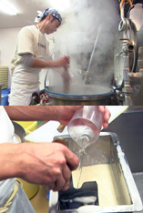 在来種大豆に国産大豆を混ぜ合わせ地下水に浸す事13時間。それをすり潰し煮ていく宏幸さん、ここで味の良し悪しが決まると言います。煮過ぎて香りが飛ばないよう細心の注意を払います。やがて部屋中に在来種大豆の香りが立ち込め、甘みが凝縮した豆乳が出来ました。それに天然のにがりを絶妙のタイミングで加え、固めていきます。緊張感漂う中、まさに全身全霊をかけた豆腐作りです。