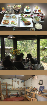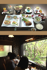 月替わりランチが楽しめる『わくわく庵』。豊後牛や新鮮野菜の料理など15品以上のメニューが揃います。デザートも付いて値段は1,180円。耕二さん自慢の離れで、庭を眺めながらのランチタイム。来客者ひとり当たりの滞在時間は平均2時間。食事と会話をのんびり楽しむ優雅な時間を過ごせます。