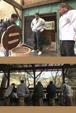 土日、祝日、“隠れ家”『時夢館』でオープンする『ねじき蕎麦』。店名はこの地域の古い地名から付けました。コンテナの中は木の温もりが感じられるたたずまいです。そばを打つのは『時夢館』のリーダー“さーやん”こと藤本定一さんです。他の4人の仲間も交代で持ち場を担当します。メンバーは、トラックドライバーの“かーやん”こと前川一幸さん。兼業農家の“とっさん”こと林敏夫さん。劇団の美術部門に勤める“おしげさん”こと清水茂さん。そして大工の“たっちゃん”こと清水辰夫さんです。みんな楽しく頑張っています。